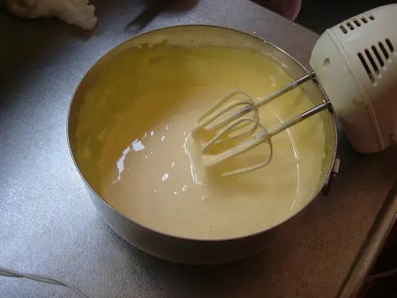 2.別のボウルに卵黄と残りの砂糖を入れ、電動ミキサーで白くもったりするまで泡立てる。サラダ油を加え、マヨネーズ状になるまで混ぜ、水とあればバニラオイルを加えて混ぜる。