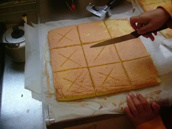 6.あら熱をとって9等分に切り、中央に浅く十字の切り目を入れる。