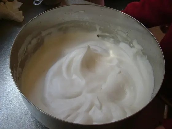1.卵白に少量の塩を加え、砂糖の半量を3回ほどに分けて加えながら電動ミキサーで角が立つまでしっかり泡立てる。
