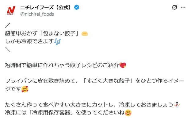 ニチレイフーズは「超簡単おかず『包まないギョーザ』 しかも冷凍できます」と投稿。「フライパンに皮を敷き詰めて、『すごく大きなギョーザ』をひとつ作るイメージです」と説明し、レシピについて次のように紹介しています。