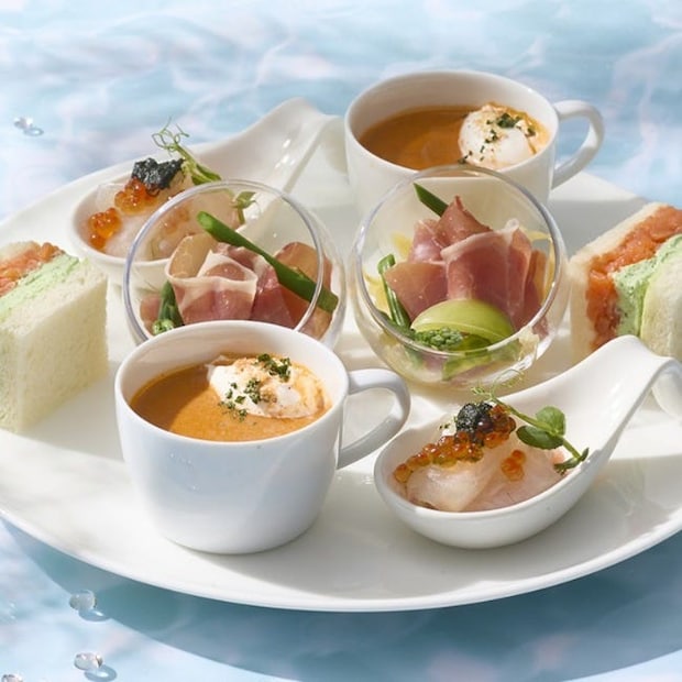 セイボリーには、甘夏のソースが爽やかな「ハモンセラーノと黄色人参のラペ 甘夏のアクセント」や、オマール海老のうまみがたっぷり詰まった「オマールビスク サワークリーム添え」、彩り豊かな「真鯛とシュリンプのマリネ ハーブクーリー」、ハーブが香るクリームチーズを合わせた「スモークサーモンとハーブクリームチーズのスティックサンド」が用意される。