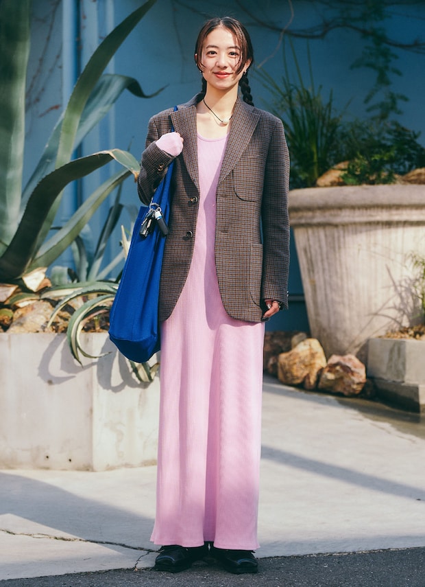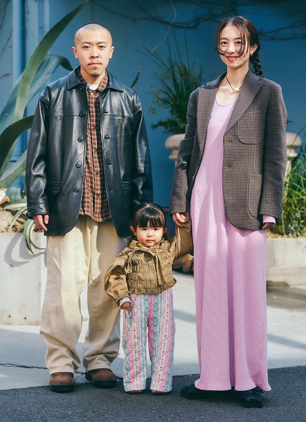 ピンク×ブラウンでつくるファミリーコーデは、チェック柄や花柄を挿して、春らしいリズミカルな装いに昇華。真っ青なバッグやレザージャケットと強めなアイテムをマイルドにして取り入れた、見事なスタイリングセンスは必見!