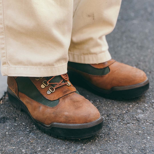 フィールドブーツを取り入れて、こなれ感たっぷりな足元。ブラウンレザーならではの味わいが感じられる一足。