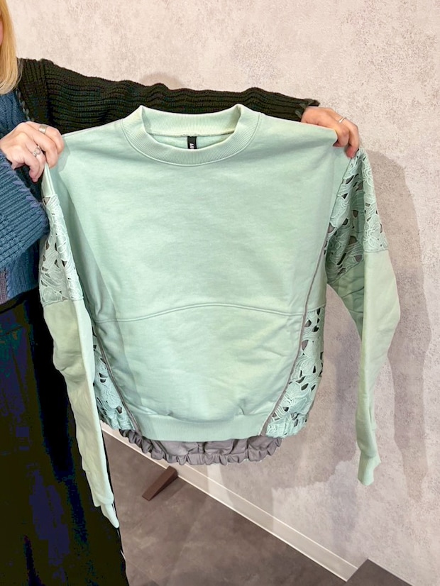 みか店長「春要素を意識するなら、リブなどの入った重く見えるものではなくスウェットなどのカットソーに見えるような軽やかさを感じるデザインを選ぶといいですよ。レースやシアー素材と組み合わさったニットもおすすめです。」