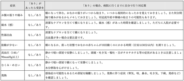 神奈川県助産師会では、妊婦さんが避難生活で気をつけたい症状や、医療機関の受診の目安を一覧表にまとめて公表しています。「気のせいかも」「まだ我慢できる」と無理をせず、心配なときは以下のチェックリストを参考にしてみてくださいね。