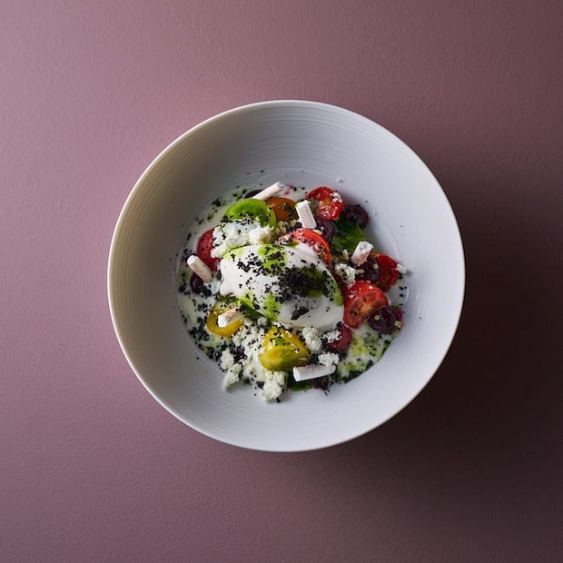 カプレーゼサラダから着想を得たシグネチャーディッシュ。自家製ヨーグルト、フレッシュトマト、マリネトマト、セミドライトマトと、異なる食感に仕立てたトマト、ベリーソース、メレンゲ、パルミジャーノ・チーズのアイスクリーム、バジルソース、そして塩味の効いたブラックオリーブパウダーで仕上げている。マリネトマトの甘さ、メレンゲのサクサクとした食感とほんのりとした甘み、そしてさっぱりとしたヨーグルトが重なり、最後のひと口まで驚きと新鮮さを感じさせる1品。