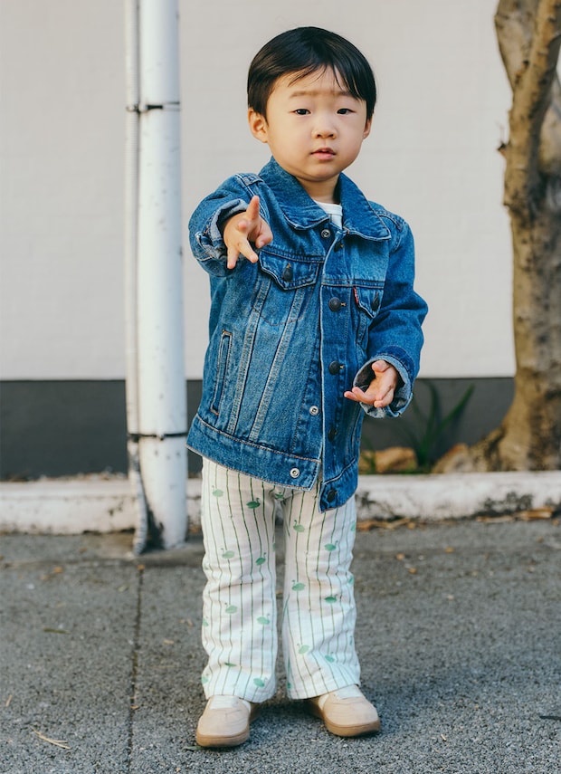 肌当たりのよい『プチバトー』のニットカーディガンに、ママのバッグとお揃いの柄ボトムスを合わせたベビーコーデ。ソックスが挿し色になってハッピームードを加速!