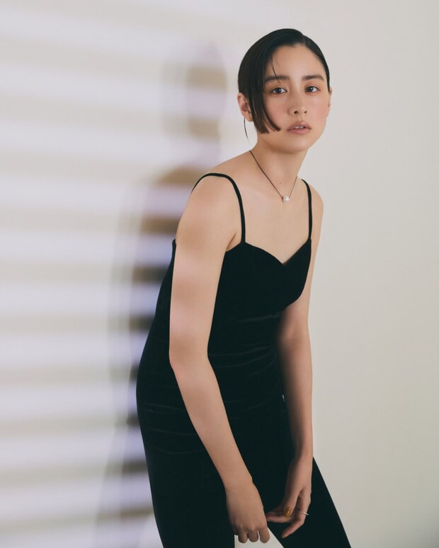 オールインワン¥46,200(ウルー)、ネックレス¥85,800(ソフィー ブハイ/エスケーパーズ アナザーワールド)、[左ページ]シャツ¥110,000(ポステレガント)、人差し指リング¥66,000、中指リング¥49,500(共にジャスティン デイビス/ジャック・オブ・オール・トレーズ プレスルーム)