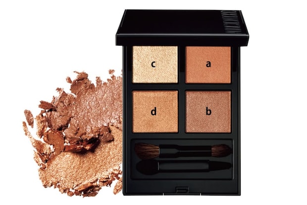 1. 目元はアディクションのザ アイシャドウパレットのaを上まぶた全体と下まぶた全体に。dをアイホールに横長を意識して入れ、下まぶたにもサラッと重ねる。bを上下まぶたのまつ毛際に入れて引き締める。仕上げにcを下まぶたにのせる。