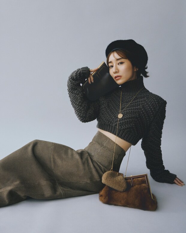 手に持ったバッグ「フェンディ ファースト スモール」〈チョコレート〉[H18×W26×D9.5㎝]¥346,500、バッグ「フェンディ ファースト スモール」〈ファー〉[H18×W26×D9.5㎝]¥643,500、チャームバッグ「ナノ フェンディ ファースト」[H10×W11.5×D5.5㎝]¥137,500、ニット¥129,800、スカート¥407,000、ベレー帽¥88,000、ネックレス¥56,100(全てフェンディ/フェンディ ジャパン)