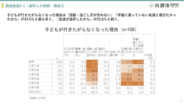 今回の調査では、小学3年生が最も多い退所時期となりましたが、小学1年生でも約2割、1年生の4月〜6月に約1割の退所が見られました。