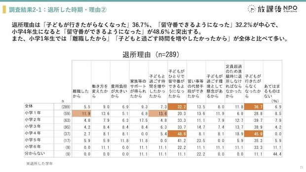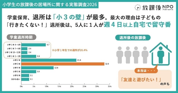 さらに、学童保育の退所後の過ごし方と影響についても調べた結果、公立学童保育の退所時期は「小学3年生」が最多(32.9%)、小学1年生の4-6月にも1割程度が退所しています。