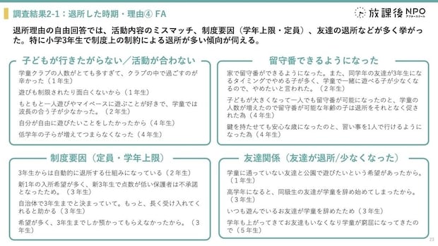 同団体が2024年に実施した調査では、小学1年生の早い段階で学童保育を退所するケースが一定割合あることや、子どもが「行きたい」と思える要因として友達と遊べる環境が重要であることが明らかになりました。