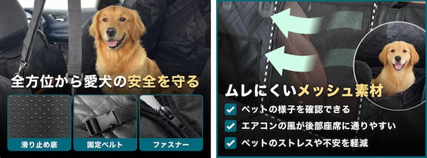 同製品は、こうした季節需要を背景に、大型犬も汚れた荷物も気兼ねなく載せやすい後部座席用ドライブシートとして開発されました。