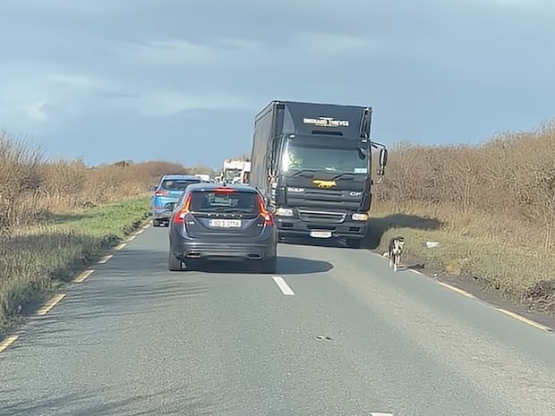 ゆっくりゆっくり、道路を歩く犬さん!