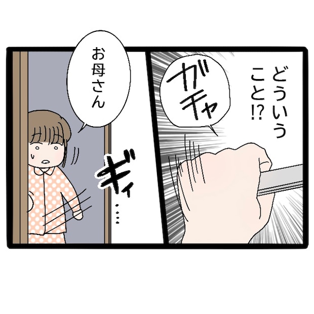 あの優しいお母さんがこんなに怒鳴るなんて、ただ事ではないはず。真相を確かめたくなった私はドアノブをそっとひねり、お母さんの名前を呼びながら、おそるおそるドアを開けました。すると、目に飛び込んできた光景に思わず驚きます。