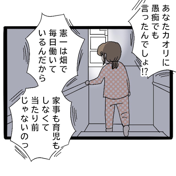 怒鳴り声は、どうやら1階から聞こえてくるようでした。胸騒ぎを覚えながら、音を立てないように階段を下りていくと、声は次第にはっきりとしてきます。「あなた、カオリに愚痴でも言ったんでしょ!?憲一は畑で毎日働いているんだから、家事も育児もしなくて当たり前じゃないのっ」どうやら、誰かが一方的に相手を責め立てているようでした。
