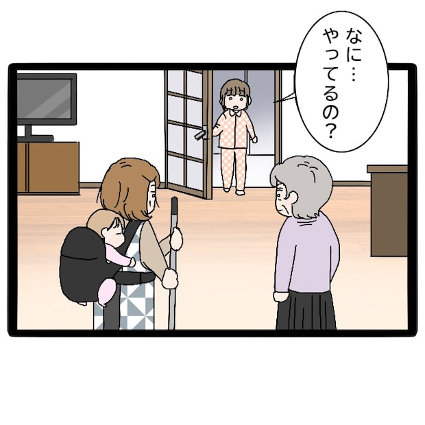 そこには、つむちゃんをおんぶしながら床掃除用のほうきを持つみずほ先輩と、その前に仁王立ちするお母さんの姿がありました。予想だにしなかった光景に、私は思わず「なに・・・やってるの?」と声をかけてしまいました。