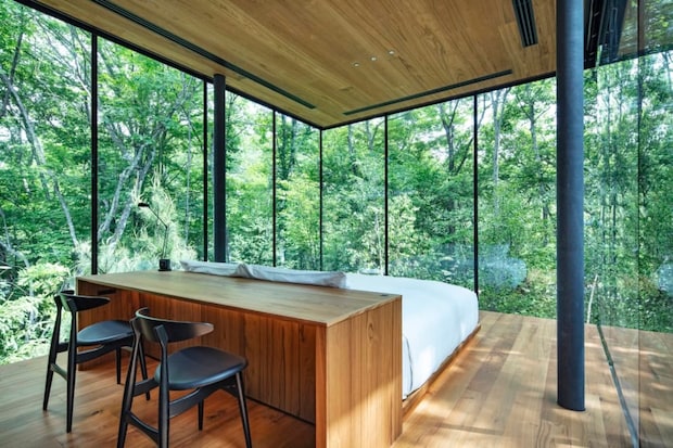「NOT A HOTEL KITAKARUIZAWA IRORI」最大の特徴は、開放感あるガラス張りの建築。一歩足を踏み入れると、そこには北軽井沢の豊かな自然が360度広がり、まるで森の中にいるかのような気分に。ただ、全面ガラス張りとなると、夏は暑く冬は寒いのでは?と思いますが心配無用。厚さ8㎝の大判のガラスを採用することで、気温に左右されない快適な室内環境を実現しています。