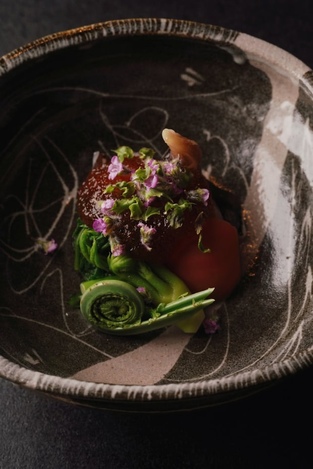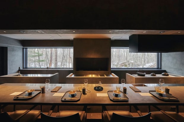 滞在中の食事は、レストラン「石朴(せきぼく)」とお部屋でのプライベートディナーから選択可能です。「石朴」は宿泊者のみが利用できるエクスクルーシブなレストラン。カウンターの前でシェフが腕を振るうのは、地元の食材をふんだんに使った囲炉裏料理です。炭火で調理される川魚やジビエなど、ここでしか味わえない料理の数々は必見。