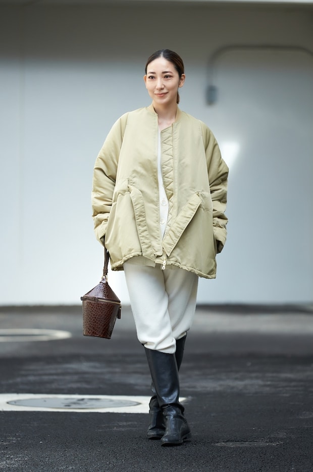 「エレガントな白のニットの上下にメンズライクなブルゾンを合わせ、あえてキレイにまとまり過ぎないようにバランスをとりました。台形シルエットが旬!」