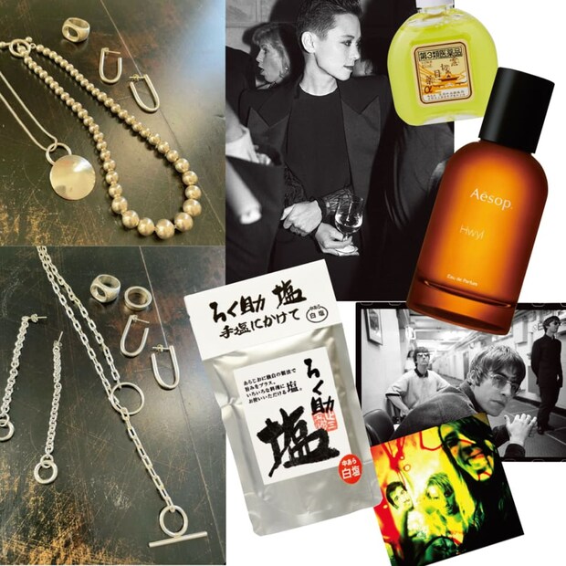 「イソップの香水『ヒュイル』は、スモーキーな香りにハマって。ろく助の白塩は昆布とシイタケの旨味が入っていてすんごく美味しい。これをつまみにお酒が飲めるかもです。ニルヴァーナとオアシスは学生時代に出会ってからずっと好き。カラオケでも歌う。雲切目薬は長野で作られていて、これまで使ったもののなかでもスッとしたつけ心地がよく、ドライアイが改善されました。ゴールドも素敵と思いつつついつい集めてしまうシルバーアクセは、アフター シェイブ クラブやララガン、Pasoなどで買い足しています。モデルのティナ・チャウは、彼女の醸し出す雰囲気とセンスがとてもタイプ。ずーっと好きです」(比留川さん)