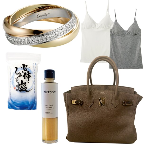 左上から時計回りに:“トリニティ”リング[ホワイトゴールド、イエローゴールド、ピンクゴールド、ダイヤモンド]¥808,500(カルティエ)は浅見さん私物、カップ付きキャミソール白、グレー各¥6,490(ロンハーマン)、エルメスのバッグは浅見さん私物、国産 玉ねぎをふんだんに使ったドレッシング¥1,000(ATAMI せかいえ)、心と体にしみる塩 1kg ¥1,620(キッズ・サポート)