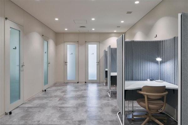 WEB面談や、一人でじっくり課題に向き合いたいときに利用できる個別ブースもある。周囲を気にせず集中できる環境で、面談にも学習にも活用できる。