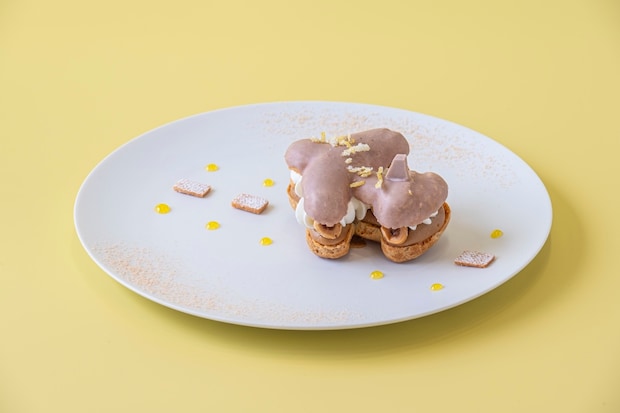 スタンド上段は、同ホテルで人気の飛行機シューをアフタヌーンティー限定フレーバーに仕上げており、今回は「ノワゼットシトロン」で提供。香ばしくコクのあるヘーゼルナッツとレモンの爽やかな酸味や香りを合わせることで、甘みと酸味のバランスが楽しめる。