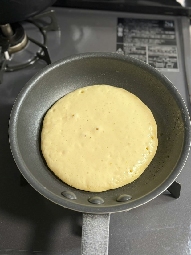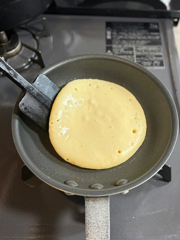 ひっくり返すタイミングは、写真2枚目のように生地中央にポコポコと気泡が現れたらひっくり返しても良い合図です。