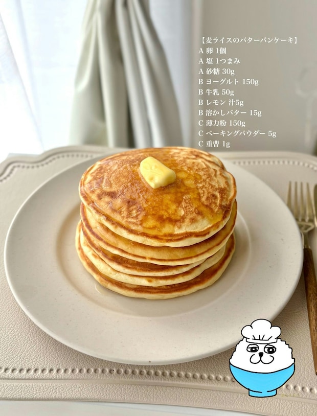 料理長を務める・麦ライス(シェフ)(@HG7654321)さんは「このレシピが一番美味しい!」とパンケーキレシピを公開。思わず試したくなる、お店のような仕上がりです…!