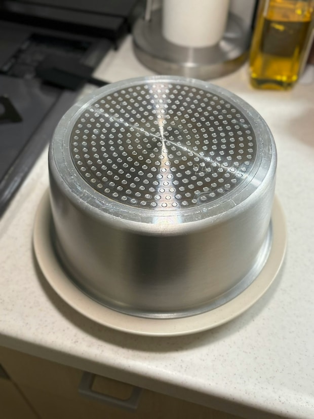 焼けたパンケーキはお皿に積み重ねますが、そのまま焼き続けると冷めて乾燥してしまうので4枚目写真のように鍋など高さのある物で蓋をすると保温できてしっとり美味しく食べられます。