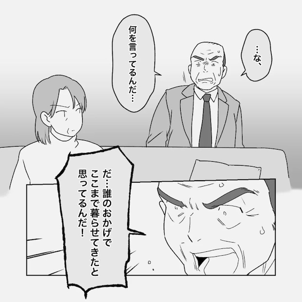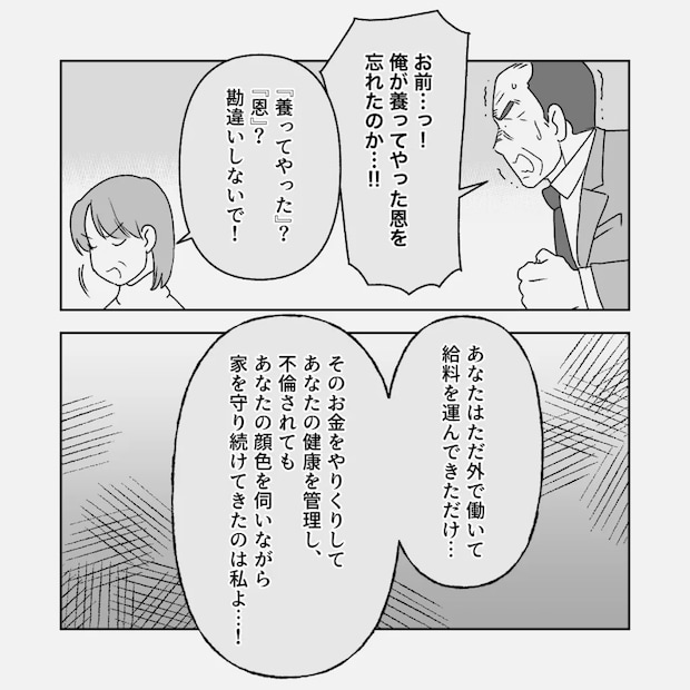「お前・・っ!俺が養ってやった恩を忘れたのか・・!!」と声を震わせながら言い返すも、「『養ってやった』?『恩』?勘違いしないで!あなたはただ外で働いて給料を運んできただけ・・。そのお金をやりくりしてあなたの健康を管理し、不倫されてもあなたの顔色を伺いながら家を守り続けてきたのは私よ・・!」義母はそう言った後、