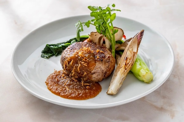 「藁で燻した粗びきハンバーグ オニオンジンジャーソース」は、独自配合の粗びきパティを使用。口に入れた瞬間、ふわりと立ちのぼる藁の香りが口の中に広がり、食欲を一層掻き立てる。藁で瞬間的に燻すことで牛肉の脂の甘みを引き出し、香ばしさをまとわせたシェフこだわりの一品だ。