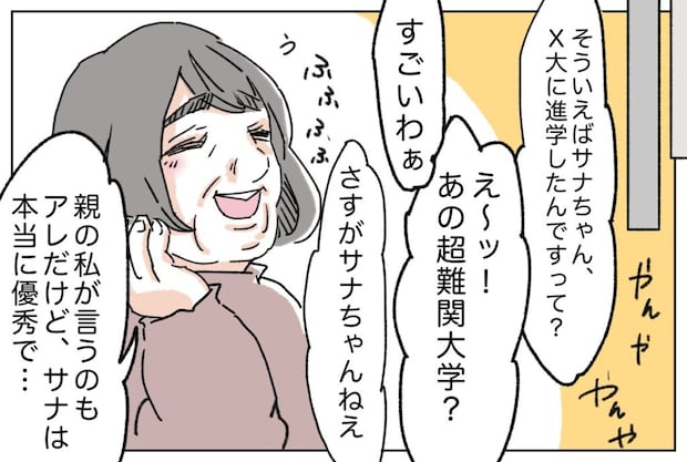 それから時が経ち、姉は超難関といわれるX大に進学。「X大に入るなんてすごいわぁ」「さすがサナちゃんねぇ」ご近所さんから褒められるたび、母は鼻高々。「親の私が言うのもアレだけど、サナは本当に優秀で・・・」そう言って、心底うれしそうな表情を浮かべていました。