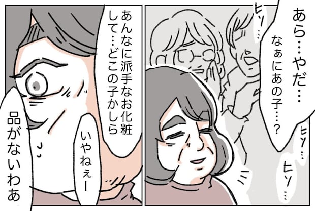 そんなとき、何かに気づいたご近所さんが、「あら、やだ・・・なぁにあの子?」「あんなに派手なお化粧して、どこの子かしら」と、ひそひそ話を始めました。母はご近所さんたちの視線の先へ目を向けると、冷や汗をかきながら、はっとした表情を浮かべます。