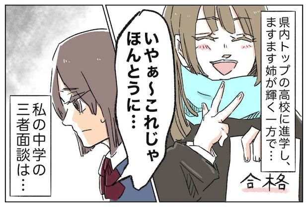 そして迎えた三者面談の日。一言で言えば、まさに地獄でした。「これじゃ本当に、どこの高校にも行けませんよ!」「困ったわ~サナのときはこんな苦労しなかったのに~」姉を知る先生と、私を出来の悪い妹だと思っている母。2人の言葉に挟まれ、心がすり減っていくのを感じました。