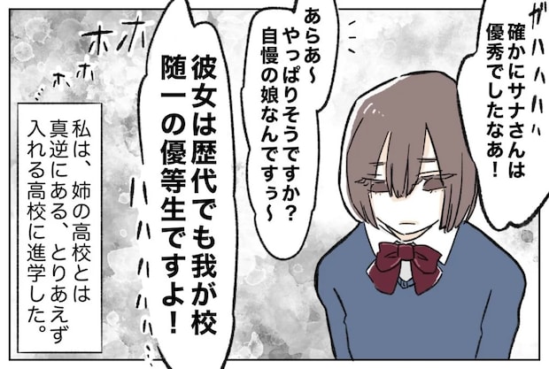 「確かにサナさんは優秀でしたな!歴代でも我が校随一の優等生ですよ」「あら~やっぱりそうですか?自慢の娘なんです」私の進路を決めるはずの面談なのに、話題は姉のことばかり。感情を押し殺しながら、ただ耐えるしかありませんでした。その後、私は姉の高校とは正反対の『とりあえず入れる高校』へ進学することになりました。