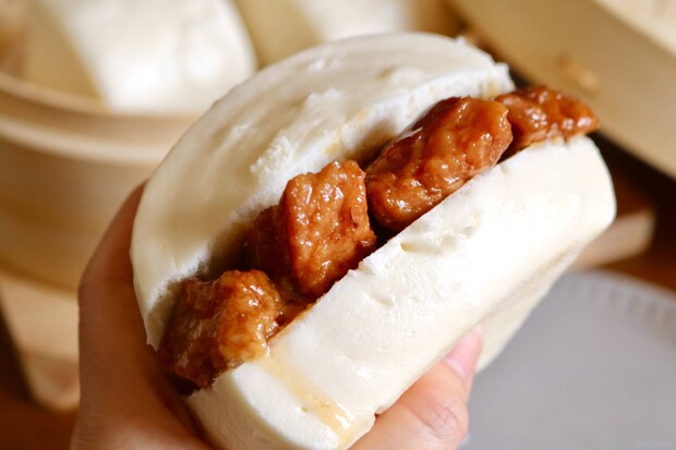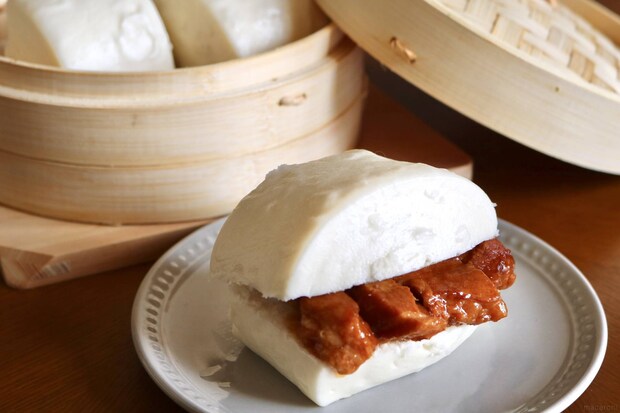 豚の角煮を挟んでひと口。ふわもちの生地にジューシーな豚肉の旨みが合わさり、まるで「角煮まん」をいただいているかのような贅沢感があります。
