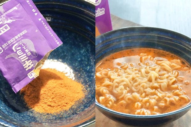「韓国風旨辛ラーメン」は、乾麺と粉末スープを一緒に5分間煮込んで完成です。湯気とともに立ちこめる唐辛子や牛肉・魚醤の香りに食欲をそそられます。