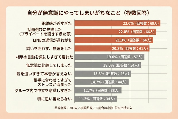 自分自身が無意識にしてしまいがちなことを複数選択で聞くと、相手に悪意を向けるというより、距離の取り方やコミュニケーションの癖に関する項目が上位になりました。