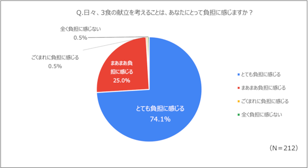 また、献立を考えることを「とても負担に感じる」という回答が74.1%、「まあまあ負担に感じる」という回答が25%ということから、多くの女性が家事の一つである献立づくりを負担に感じていると考えられます。