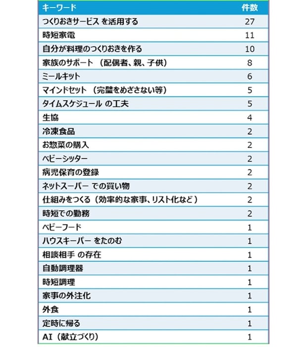 不安の解消には、「つくりおきサービスを利用する」「時短家電」といった家事負担を解消するサービスや製品の回答が多く、ほか、「自分が料理のつくりおきを作る」「家族のサポート」といった家族内での助け合いや、自分が家事を行うという回答もありました。