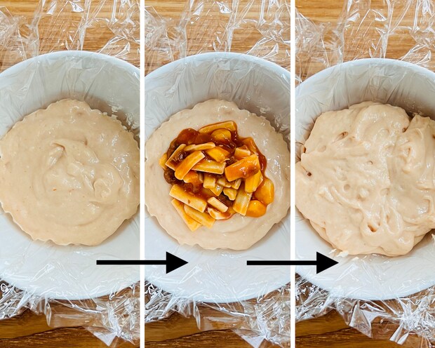 深さのある耐熱の器にラップを敷きます。生地と具を1/2量ずつ使用して、生地→具→生地の順に重ねます。
