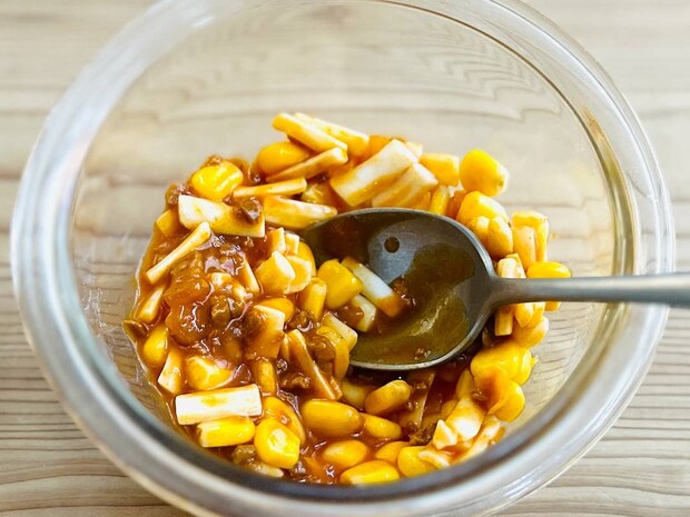 コーンを入れるのが「ピザ」感を出すポイント。ピザソースを使わなくても、しっかりピザまんらしく仕上がります。