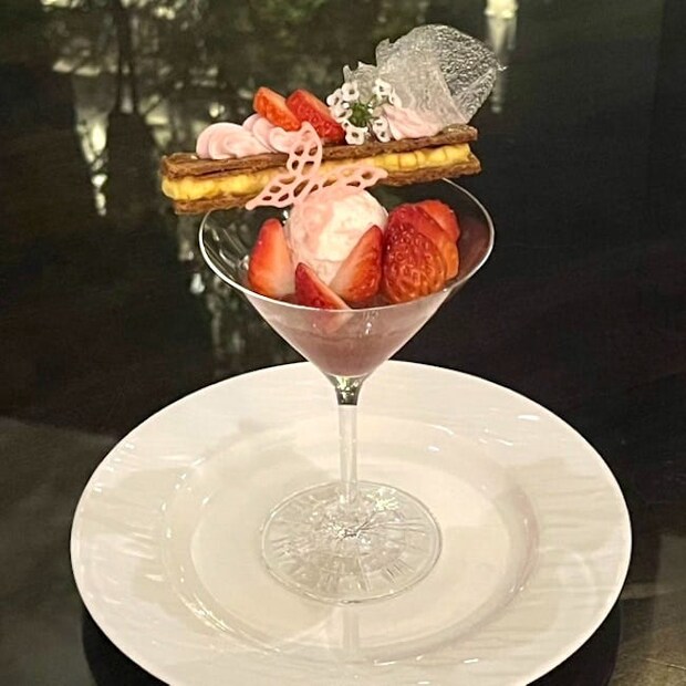 グラスの上にサクサクのミルフィーユ、たっぷりのいちごや飴細工、蝶をかたどったクッキーなどを飾っていて華やか。グラスの中は、桜といちごのジュレ、シャンパンジュレに塩気のある桜のミルクアイスを重ねており、食べ進めるごとに変わる春らしい味わいが感じられます。アイスによって口が冷えたら、ミルフィーユを。卵のコクとバニラのアロマが贅沢なカスタードクリームを香ばしくキャラメリゼしたパイでサンドしており、サクサクながらもふんわりしていてどこか懐かしさを感じました。