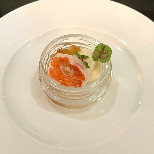 3種のセイボリーのなかでも気に入ったのが「天使海老のマリネ カリフラワームースとコンソメジュレ」。とにかく、天使海老が大きい! 丁寧に処理、火入れをしているからプリプリで食べ応えがありました。また、クリーミーで優しいカリフラワーのムースやさっぱりとしたコンソメのジュレが味わいを引き立ており、美味。コース料理の1品を食べているかのようなリッチなメニューでした。