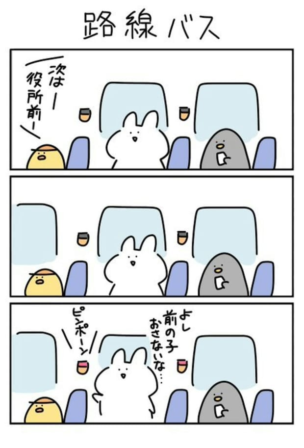 前に座った子が降車ボタンを押さないのを確認後に押したうさぎさん。子どもが「次降りる?ボタン押していい?」と親に話しているのを聞くことがあります。きっと子どもにとっては何だか特別なことで、押すのはドキドキ。そんなとき近くにいると、ぜひ譲ってあげたい気持ちになりますね。
