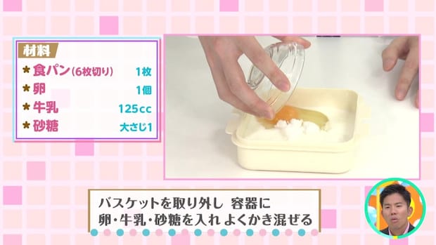 そのままレンジ(500W)で3分加熱するだけ!容器が食パンサイズに設計されているため、卵液を無駄なく吸収。