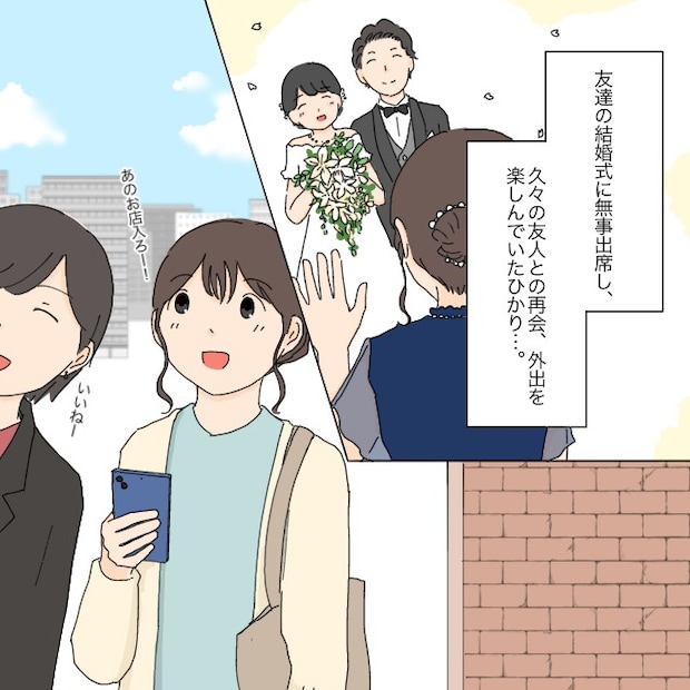 翌日、私は予定通りマミの結婚式に参列しました。ウエディングドレスに身を包んだマミは本当に綺麗で、思わず涙がこぼれます。子どもたちを産んで以来、久しぶりに参列する結婚式。この多幸感あふれる空間は、やはり結婚式でしか味わえないものだと実感しました。不安はあったけれど、夫に子どもたちを預けてきてよかった。